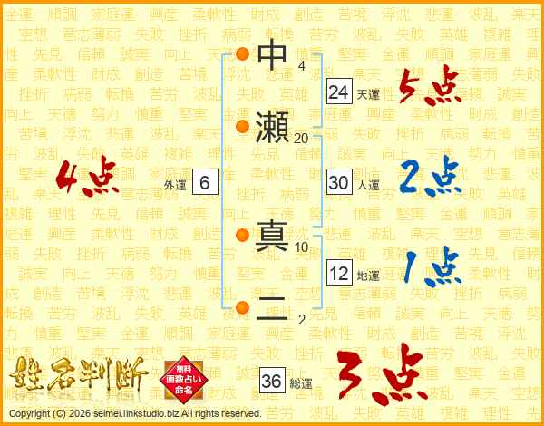 あなたの人生を表す1番重要な運勢です。生涯を通じて影響する総合運となり、主に50歳以降の晩年期に影響を及ぼします。苗字と名前の合計画数。