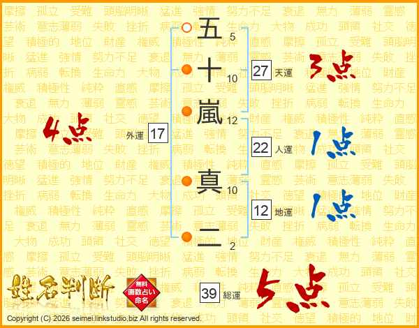 五(5画)十(10画)嵐(12画) 真(10画)二(2画)