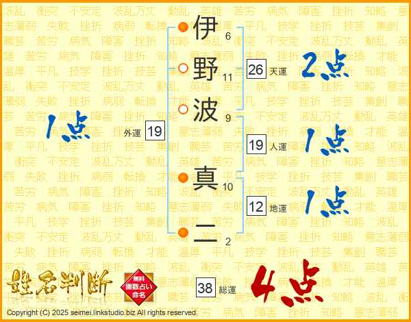 伊(6画)野(11画)波(9画) 真(10画)二(2画)