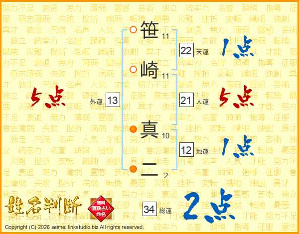 あなたの人生を表す1番重要な運勢です。生涯を通じて影響する総合運となり、主に50歳以降の晩年期に影響を及ぼします。苗字と名前の合計画数。