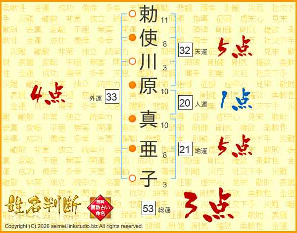 勅(11画)使(8画)川(3画)原(10画) 真(10画)亜(8画)子(3画)