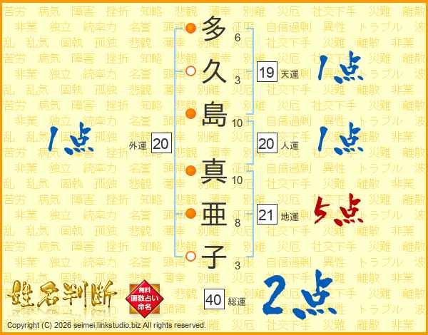 多(6画)久(3画)島(10画) 真(10画)亜(8画)子(3画)
