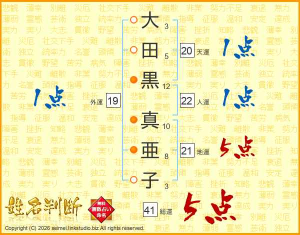 大田黒真亜子さんの総運は41画の5点!