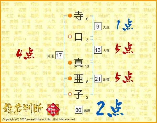 寺(6画)口(3画) 真(10画)亜(8画)子(3画)