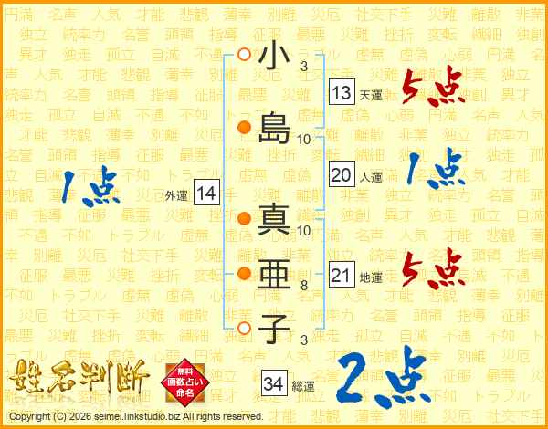 小島真亜子さんの総運は34画の2点!