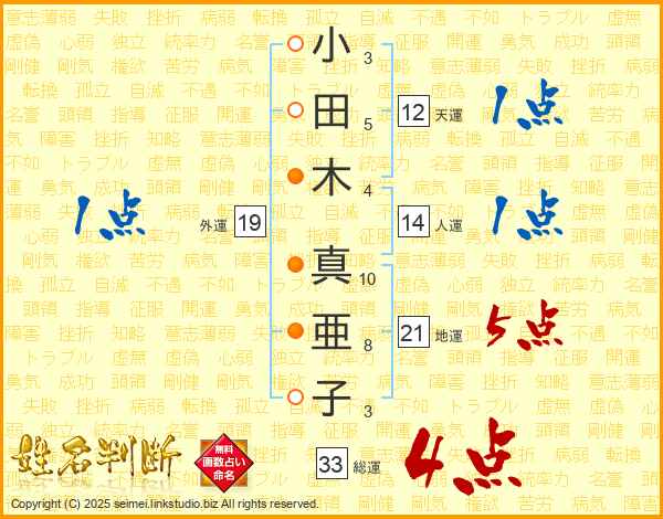 小(3画)田(5画)木(4画) 真(10画)亜(8画)子(3画)