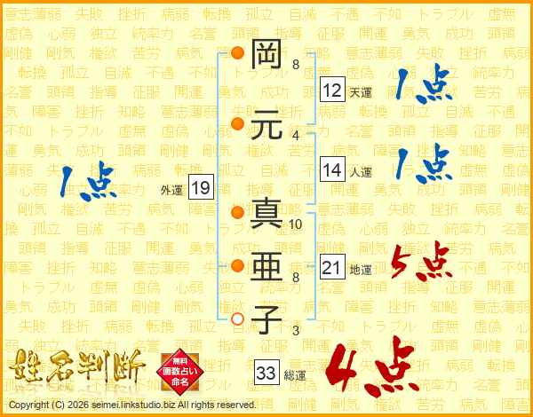 岡(8画)元(4画) 真(10画)亜(8画)子(3画)