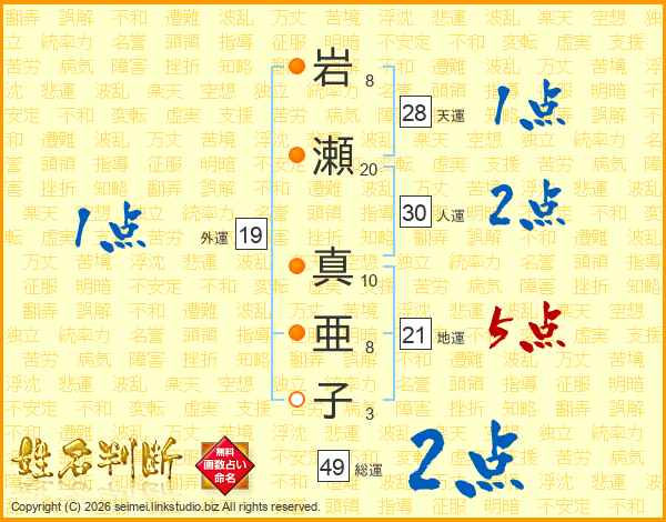 岩(8画)瀬(20画) 真(10画)亜(8画)子(3画)