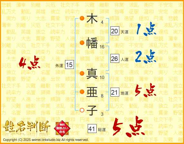 木(4画)幡(16画) 真(10画)亜(8画)子(3画)