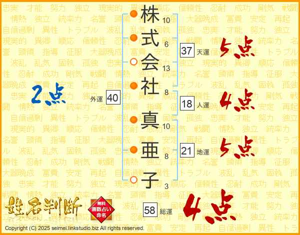 株(10画)式(6画)会(13画)社(8画) 真(10画)亜(8画)子(3画)
