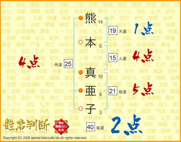 熊(14画)本(5画) 真(10画)亜(8画)子(3画)
