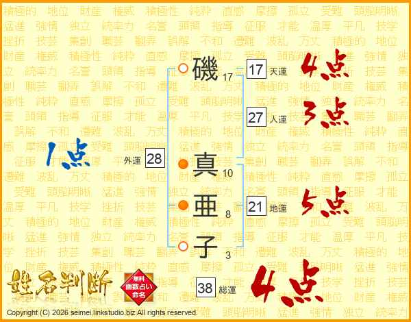 生活面を象徴する運勢です。外部から受ける影響力を表し、結婚運、家庭運や職場、環境への順応性を表します。総運から人運を引いた画数。姓や名が1文字の場合を除く。