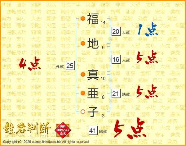 福(14画)地(6画) 真(10画)亜(8画)子(3画)