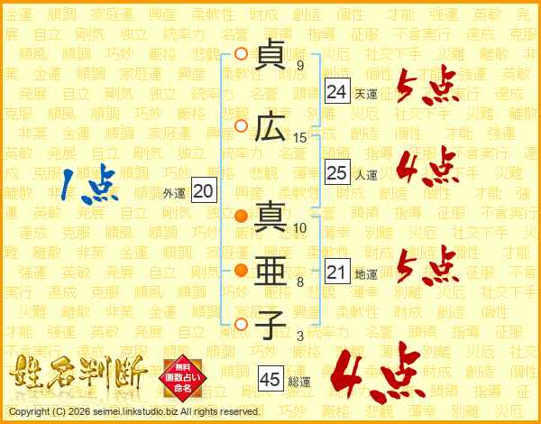 貞(9画)広(15画) 真(10画)亜(8画)子(3画)