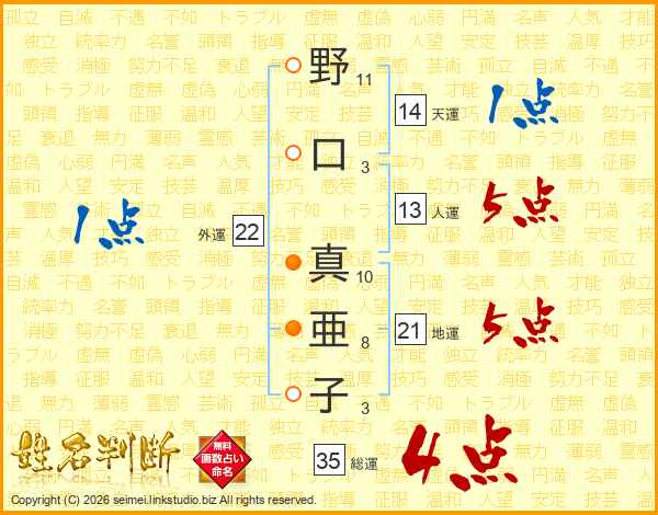 野(11画)口(3画) 真(10画)亜(8画)子(3画)