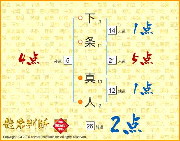 生活面を象徴する運勢です。外部から受ける影響力を表し、結婚運、家庭運や職場、環境への順応性を表します。総運から人運を引いた画数。姓や名が1文字の場合を除く。