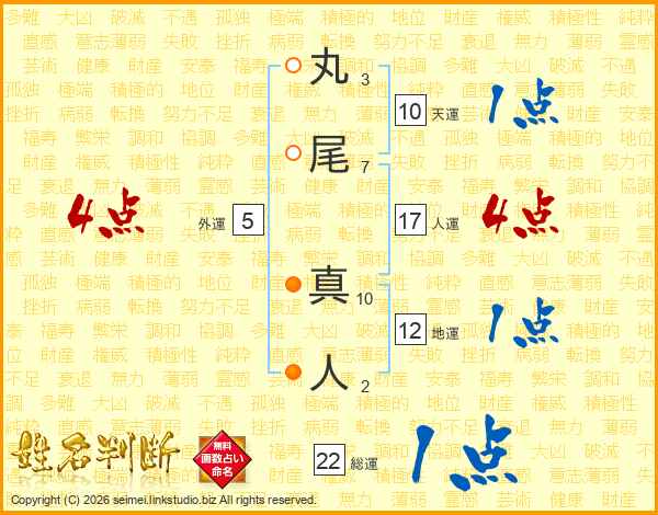 生活面を象徴する運勢です。外部から受ける影響力を表し、結婚運、家庭運や職場、環境への順応性を表します。総運から人運を引いた画数。姓や名が1文字の場合を除く。