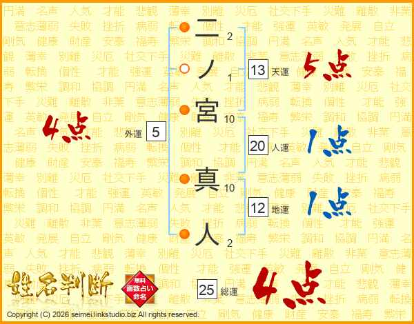二ノ宮真人さんの総運は25画の4点!