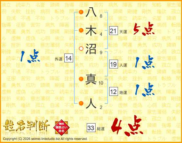 八木沼真人さんの総運は33画の4点!