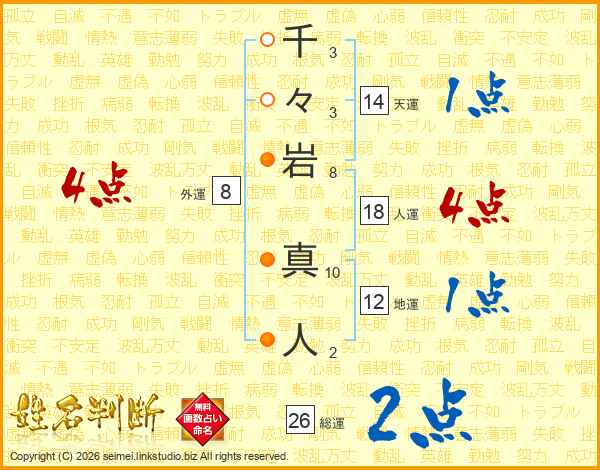 千々岩真人さんの総運は26画の2点!
