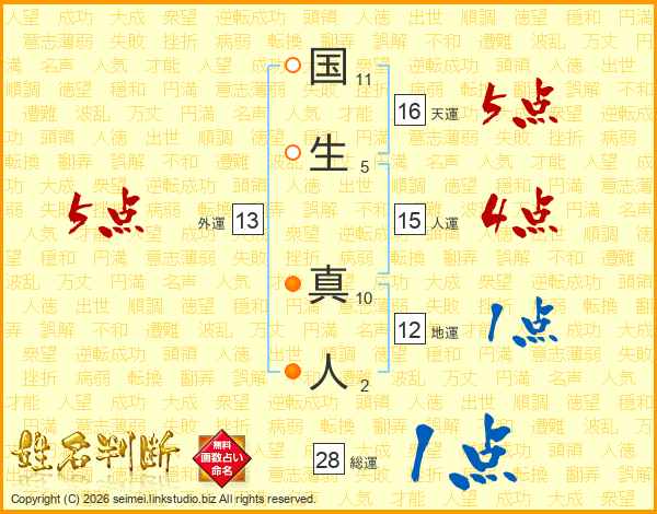 国生真人さんの総運は28画の1点!