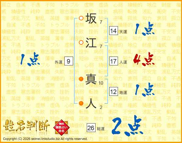 生活面を象徴する運勢です。外部から受ける影響力を表し、結婚運、家庭運や職場、環境への順応性を表します。総運から人運を引いた画数。姓や名が1文字の場合を除く。