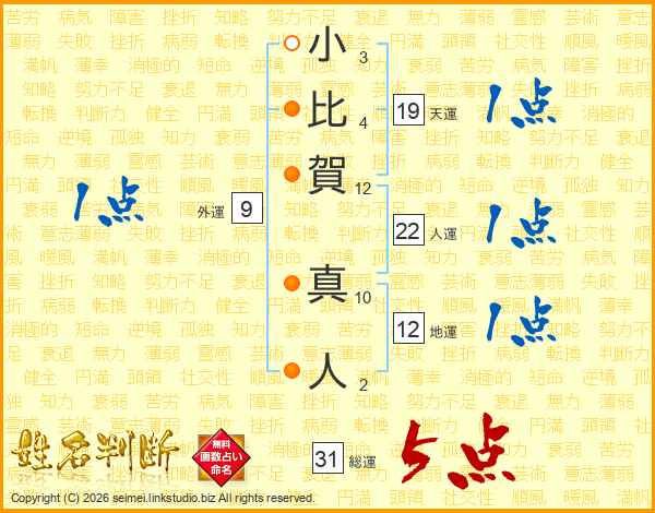 小(3画)比(4画)賀(12画) 真(10画)人(2画)