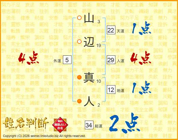 あなたの人生を表す1番重要な運勢です。生涯を通じて影響する総合運となり、主に50歳以降の晩年期に影響を及ぼします。苗字と名前の合計画数。
