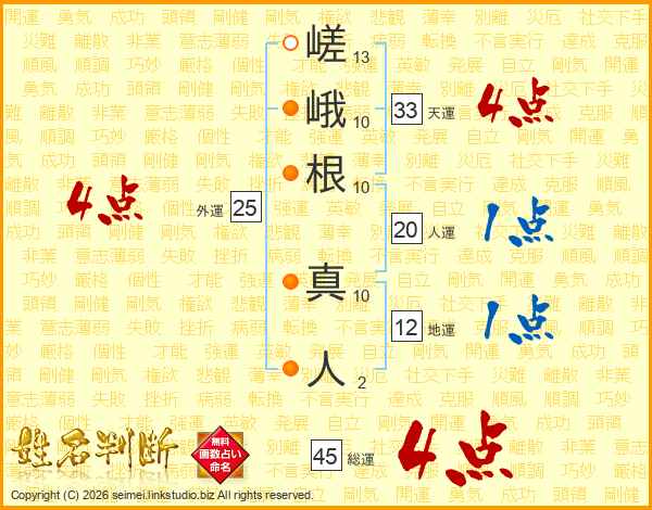 嵯(13画)峨(10画)根(10画) 真(10画)人(2画)