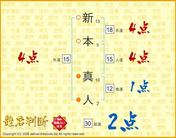 あなたの人生を表す1番重要な運勢です。生涯を通じて影響する総合運となり、主に50歳以降の晩年期に影響を及ぼします。苗字と名前の合計画数。