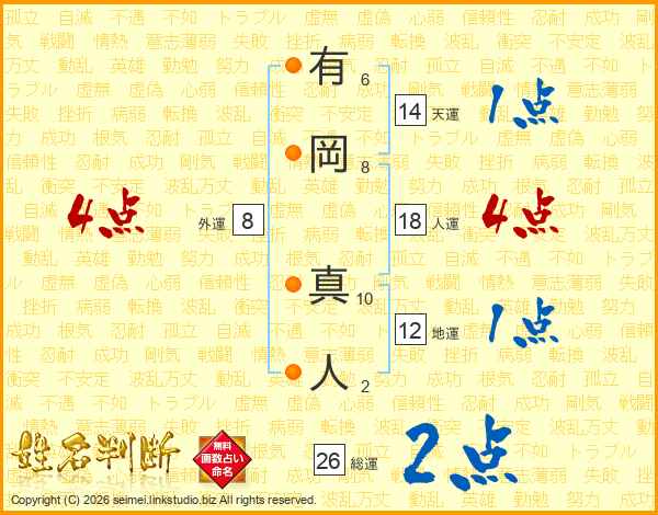 生活面を象徴する運勢です。外部から受ける影響力を表し、結婚運、家庭運や職場、環境への順応性を表します。総運から人運を引いた画数。姓や名が1文字の場合を除く。