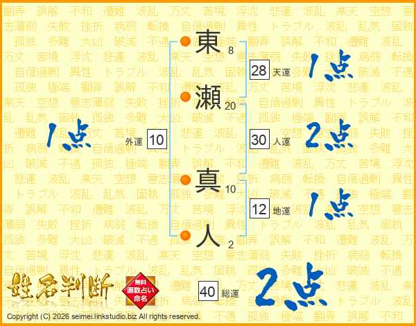 生活面を象徴する運勢です。外部から受ける影響力を表し、結婚運、家庭運や職場、環境への順応性を表します。総運から人運を引いた画数。姓や名が1文字の場合を除く。