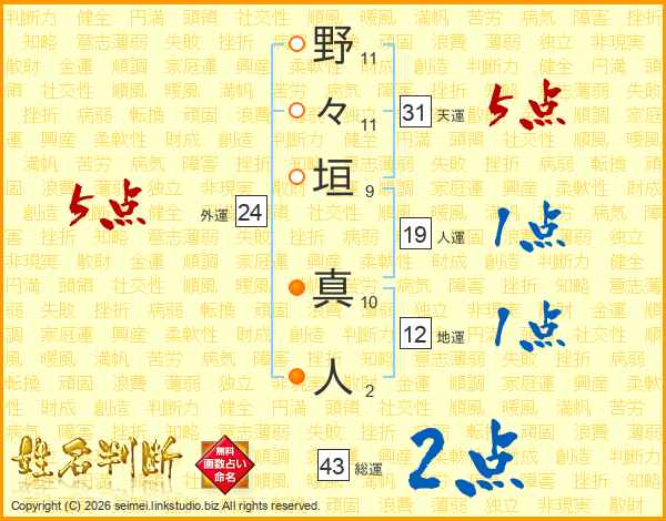 野(11画)々(11画)垣(9画) 真(10画)人(2画)