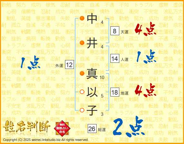 中(4画)井(4画) 真(10画)以(5画)子(3画)
