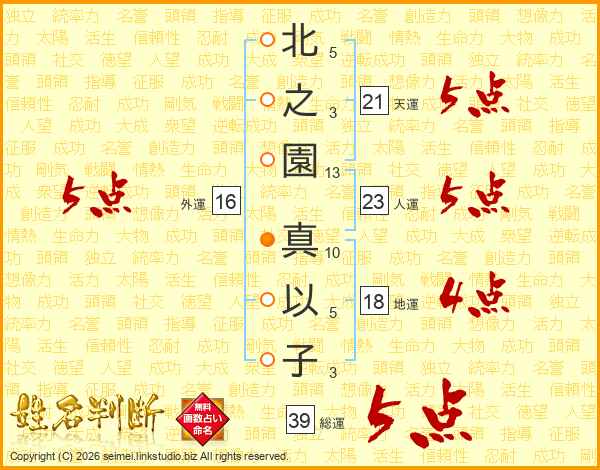 北(5画)之(3画)園(13画) 真(10画)以(5画)子(3画)