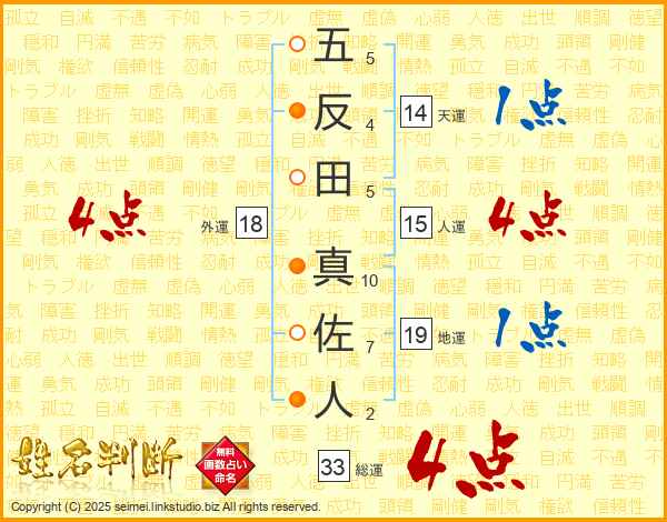 五(5画)反(4画)田(5画) 真(10画)佐(7画)人(2画)
