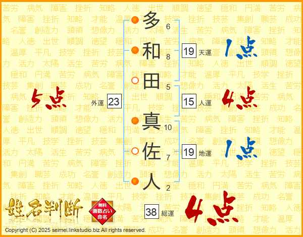 多(6画)和(8画)田(5画) 真(10画)佐(7画)人(2画)