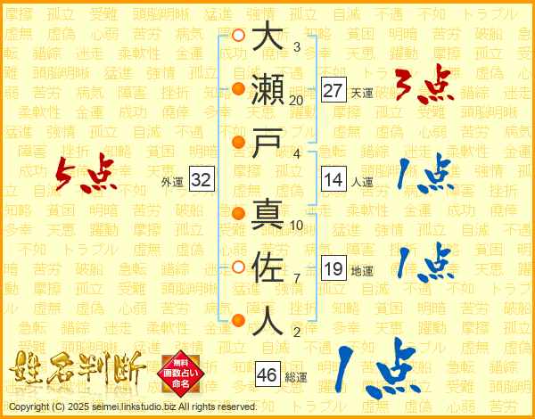 大(3画)瀬(20画)戸(4画) 真(10画)佐(7画)人(2画)