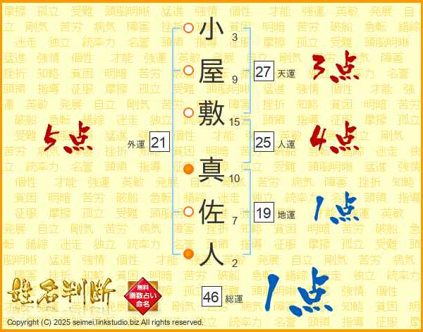 小(3画)屋(9画)敷(15画) 真(10画)佐(7画)人(2画)