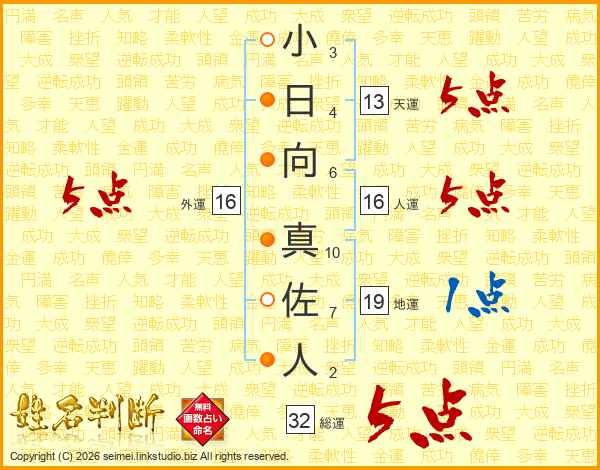 小(3画)日(4画)向(6画) 真(10画)佐(7画)人(2画)