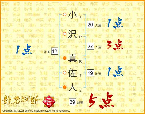 小沢真佐人さんの総運は39画の5点!