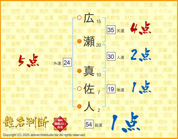 広(15画)瀬(20画) 真(10画)佐(7画)人(2画)