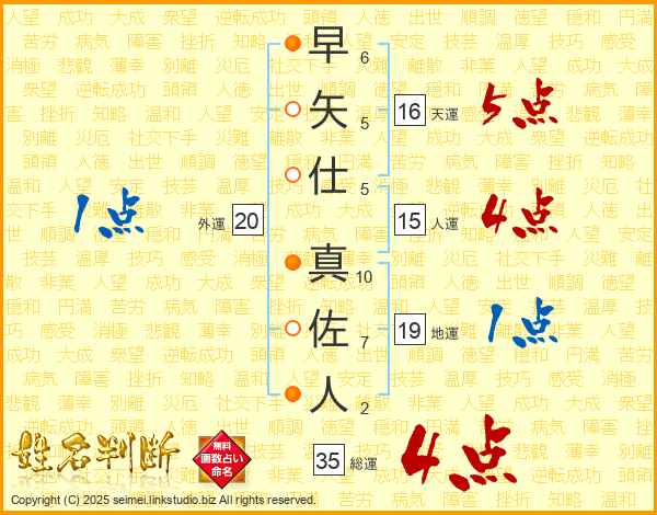 早矢仕真佐人さんの総運は35画の4点!