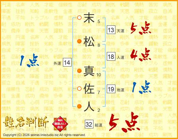 末松真佐人さんの総運は32画の5点!