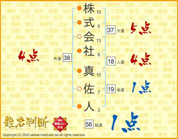株(10画)式(6画)会(13画)社(8画) 真(10画)佐(7画)人(2画)