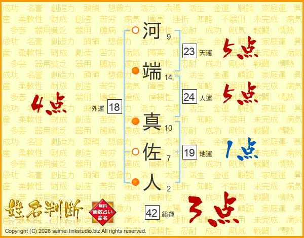 河(9画)端(14画) 真(10画)佐(7画)人(2画)