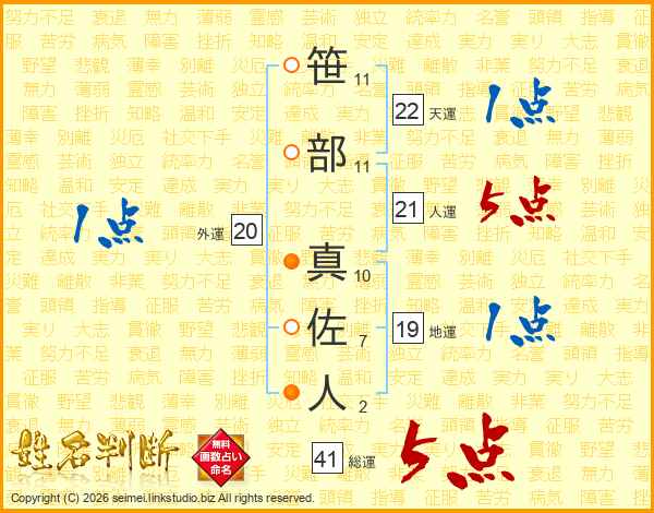 笹部真佐人さんの人運は21画の5点!