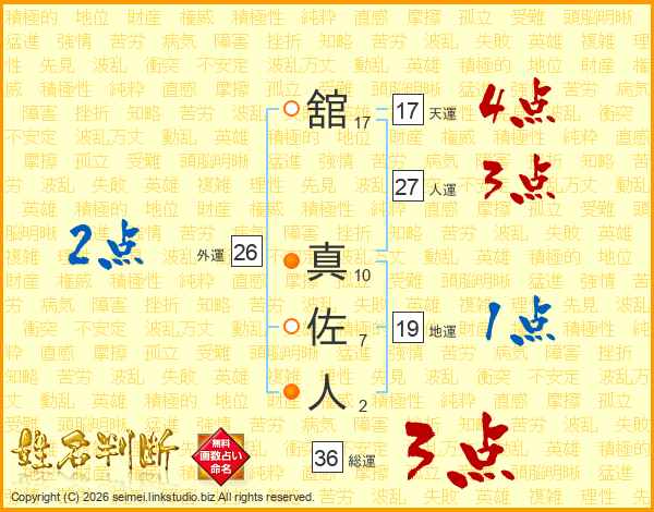 生活面を象徴する運勢です。外部から受ける影響力を表し、結婚運、家庭運や職場、環境への順応性を表します。総運から人運を引いた画数。姓や名が1文字の場合を除く。