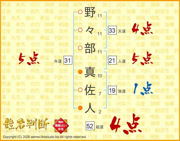野々部真佐人さんの総運は52画の4点!