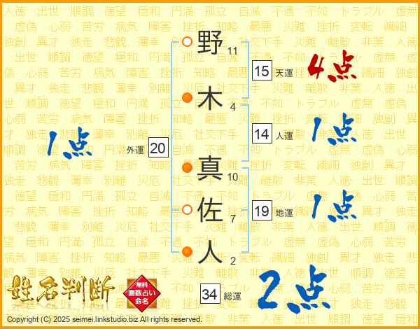 野木真佐人さんの人運は14画の1点!